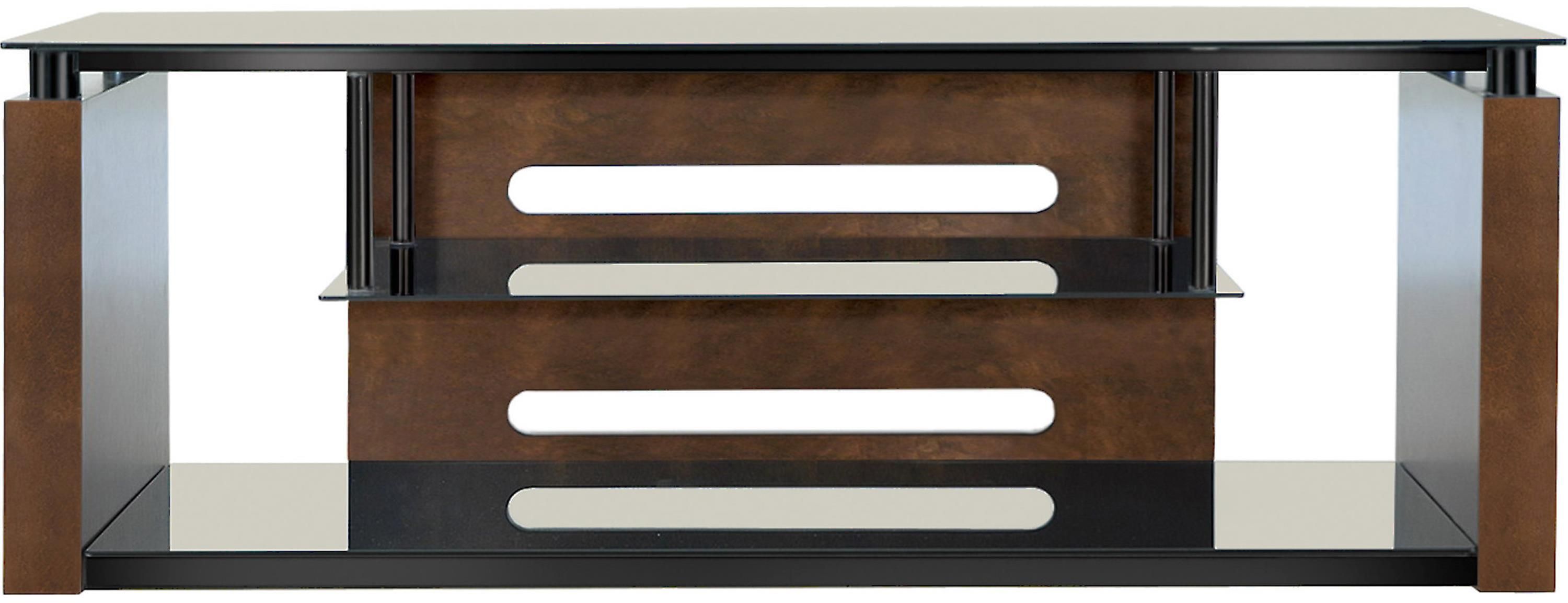Attractive and sturdy, this contemporary design with a hanging shelf is constructed of scratch resistant, High Gloss Black powder-coated metal and Black tempered safety glass accented with beautiful Espresso finished sides and back. It will accommodate most Flat Panel TVs up to 65" or 125 lbs., plus at least five audio/video components and a center channel speaker.Read More